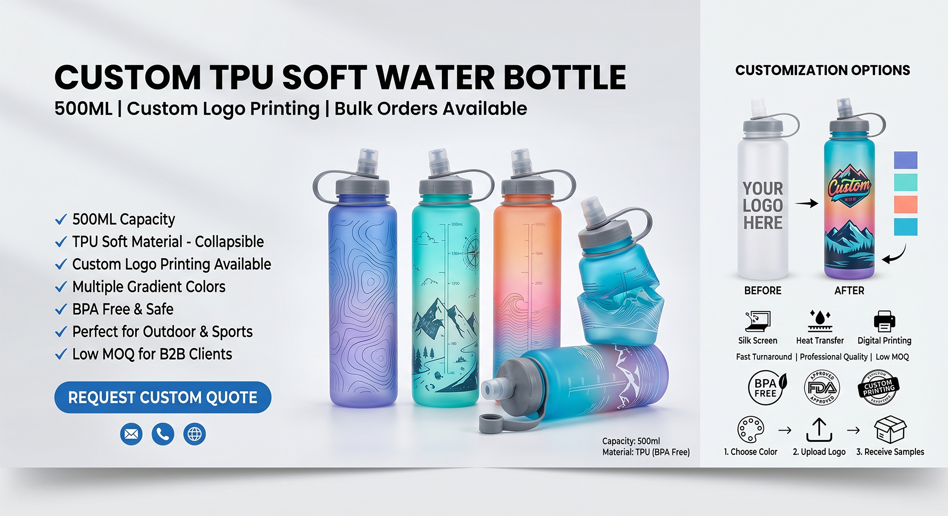 Our hydration bladders are designed with full modular customization to meet your brand’s unique needs. Every component can be disassembled and freely combined, allowing you to customize the color of the bladder body, drinking tube, bite valve, and water outlet individually. We support custom printed sheets and personalized logo printing on the surface to enhance your brand identity.